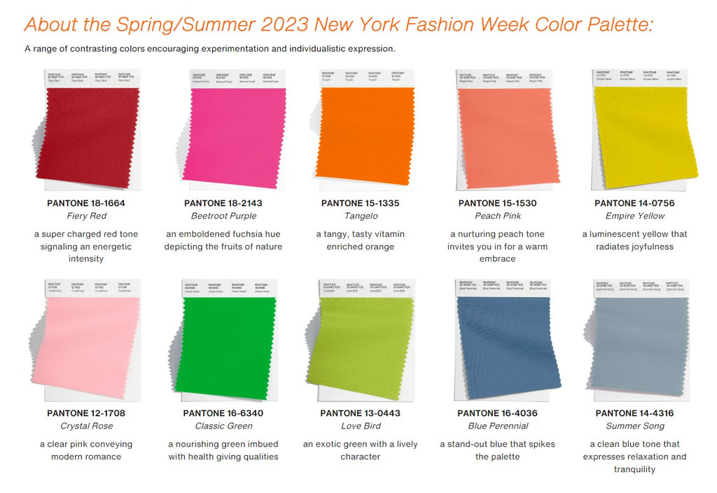 According to Pantone Color Institute experts, colors for Spring/Summer 2023 New York reflects how our experience of the past few years has influenced our relationship with color. Embracing a fearless approach that ranges from chaos to quiet, we strive forward with a color palette that celebrates a newfound freedom and the excitement of trying something new. Colors and color combinations that lend themselves to experimentation and quirky contrasts highlight our desire for individualism encouraging us to express ourselves in unexpected ways.